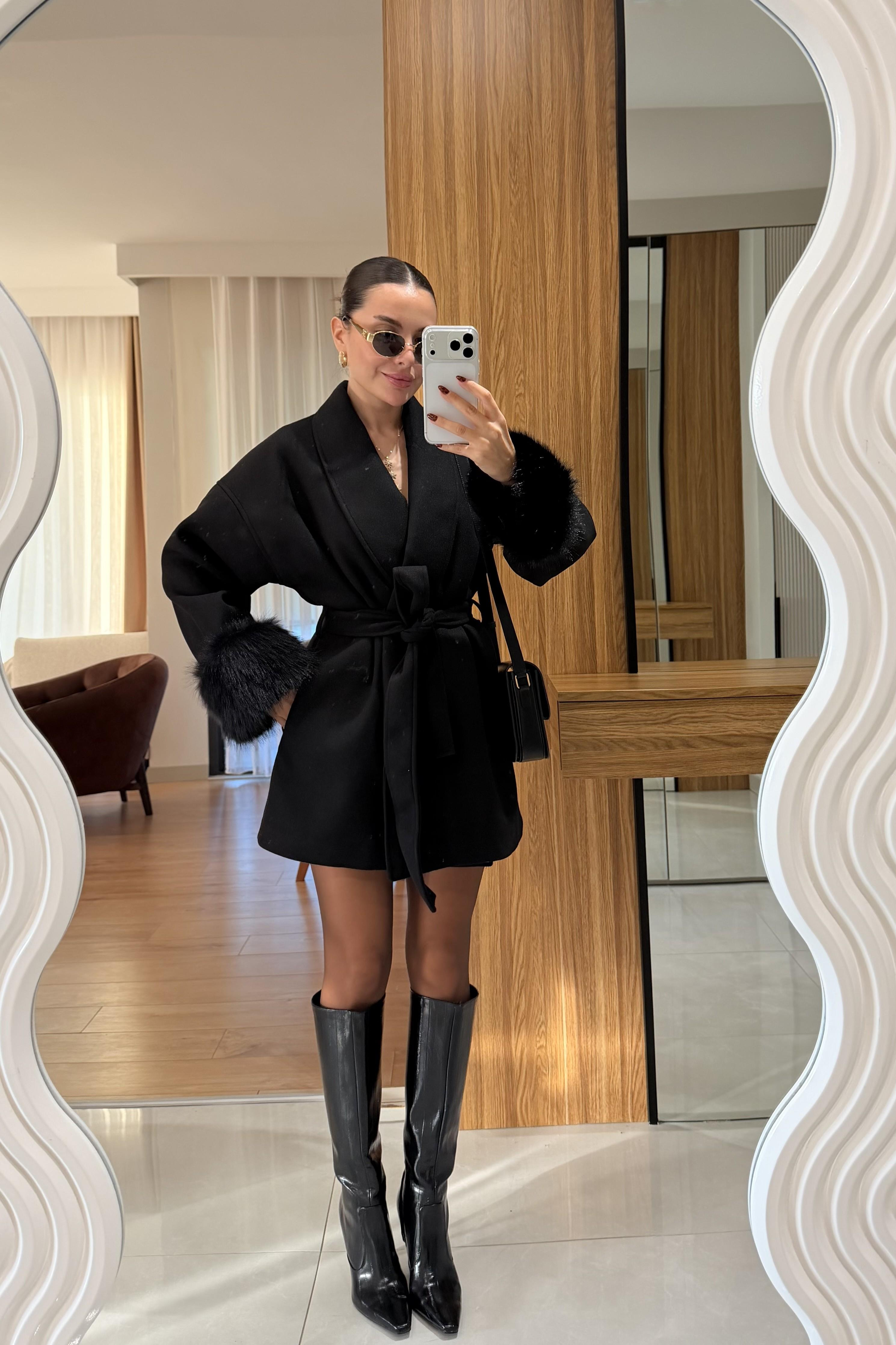 Athena Siyah Kolları Peluş Kaşe Kaban (Z5620)
