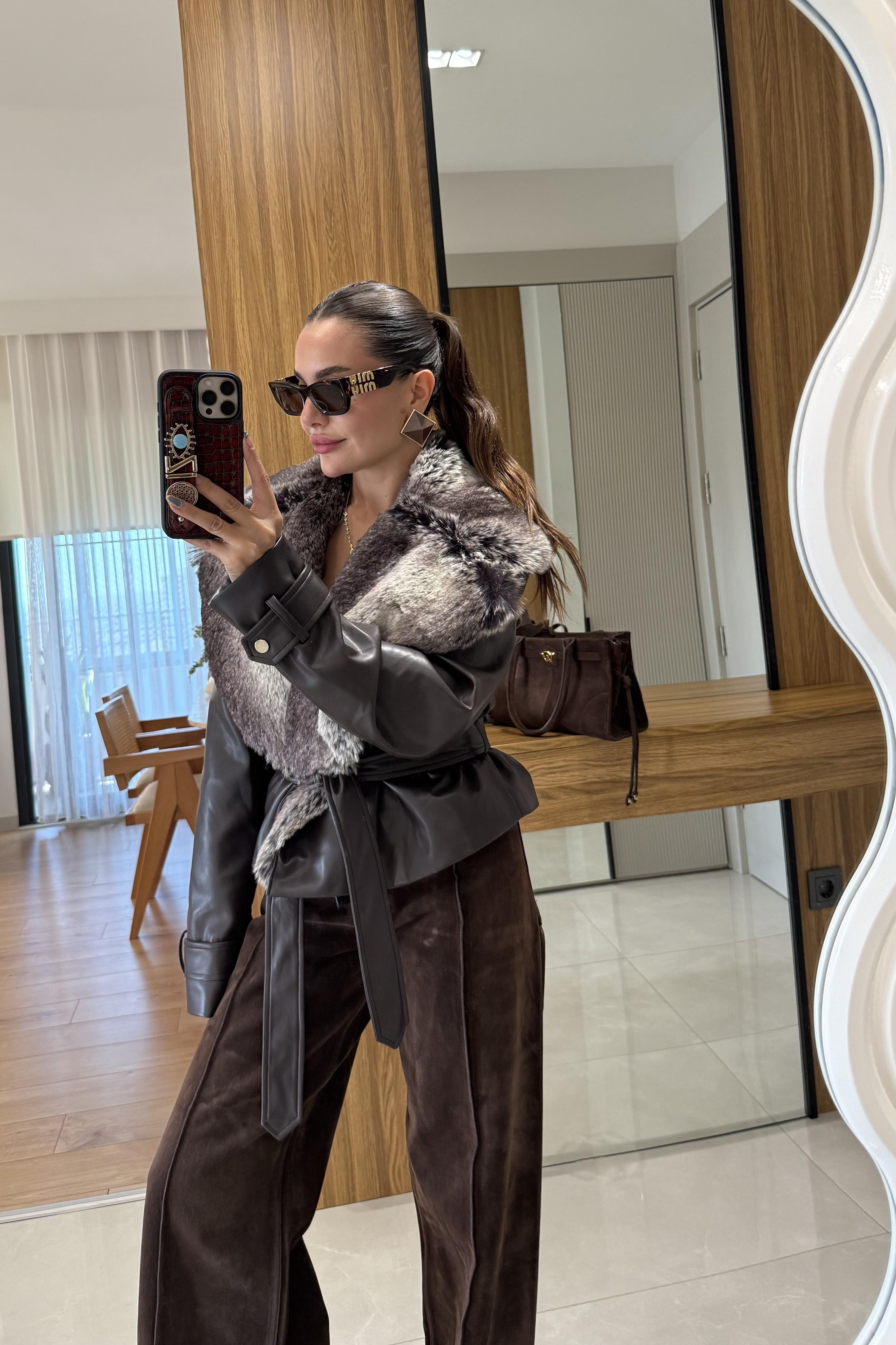 Belland Acı Kahve Premium Kürklü Deri Mont