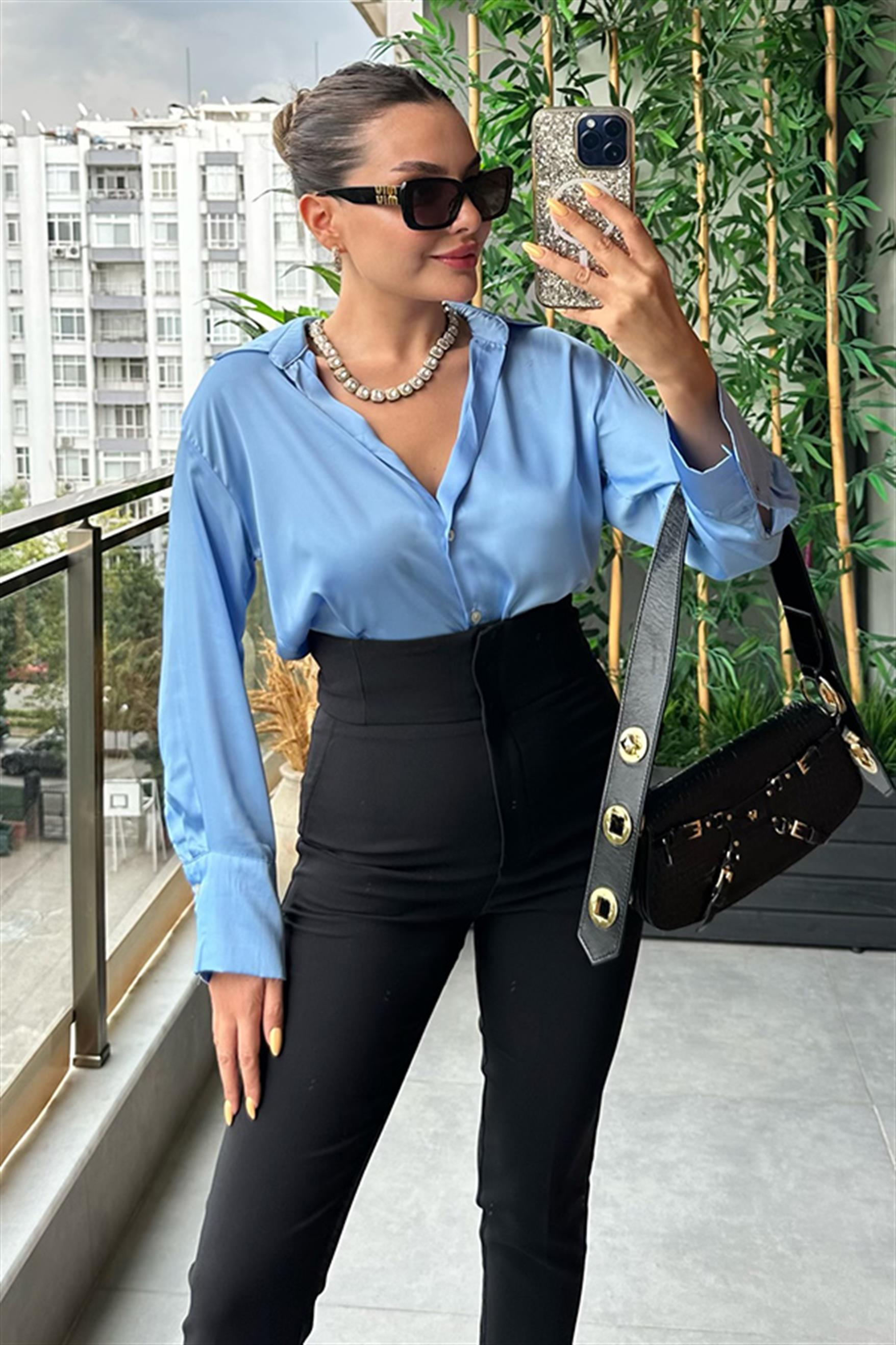 Blue saten basic gömlek