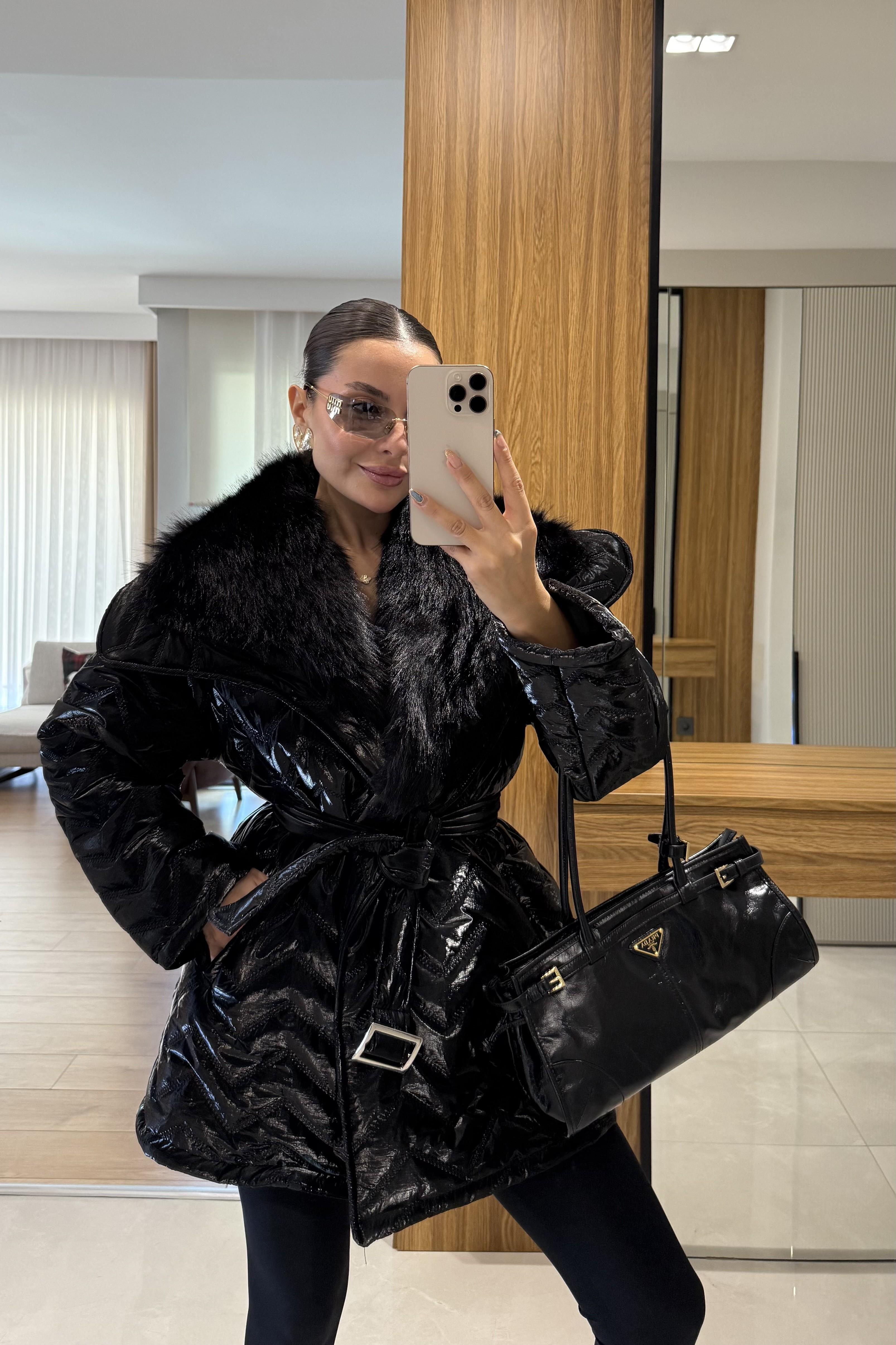 Colmar Siyah Kürklü Kemerli Şişme Mont (Z5400)