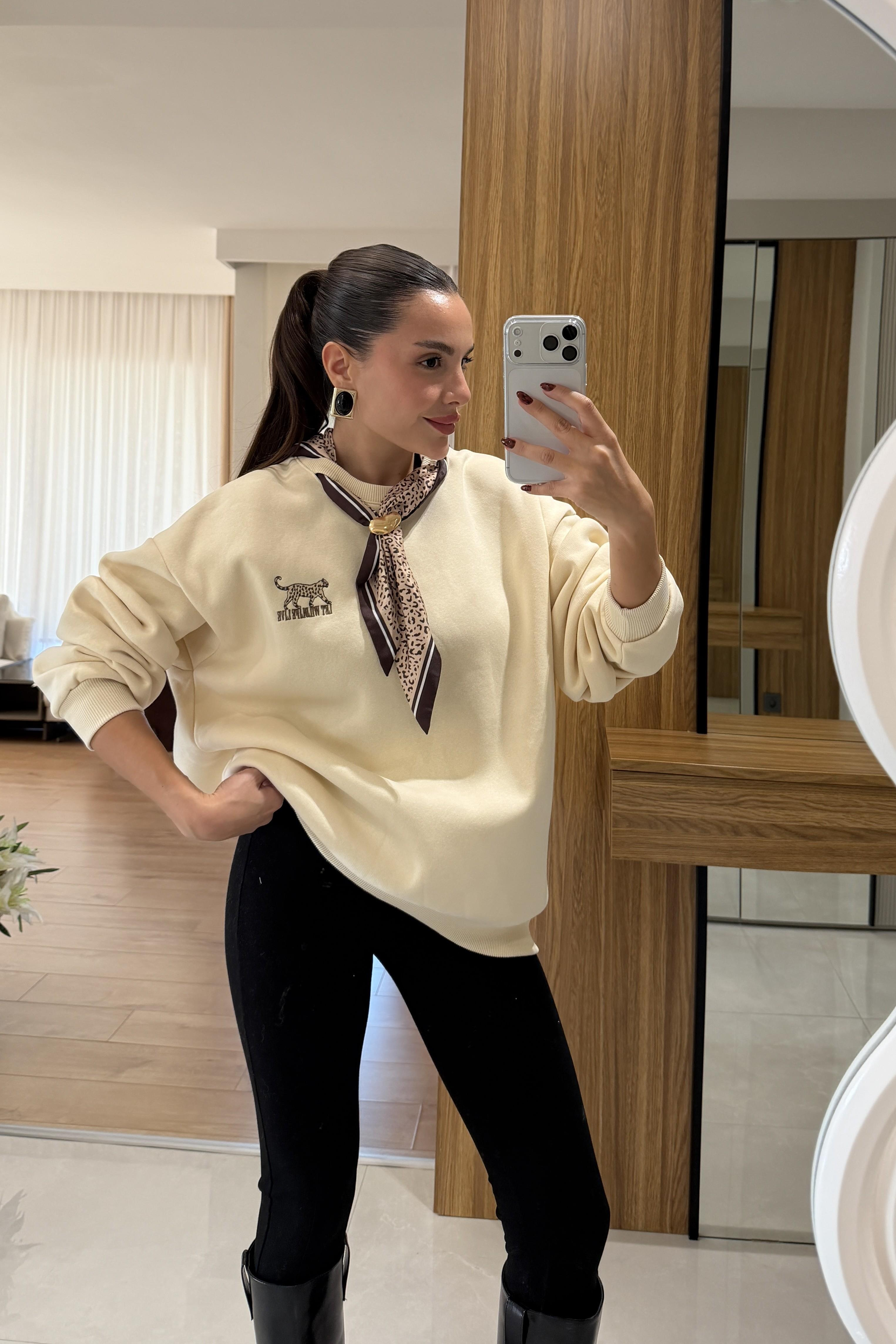 Deer Bej Fular Detaylı Tasarım Sweatshirt