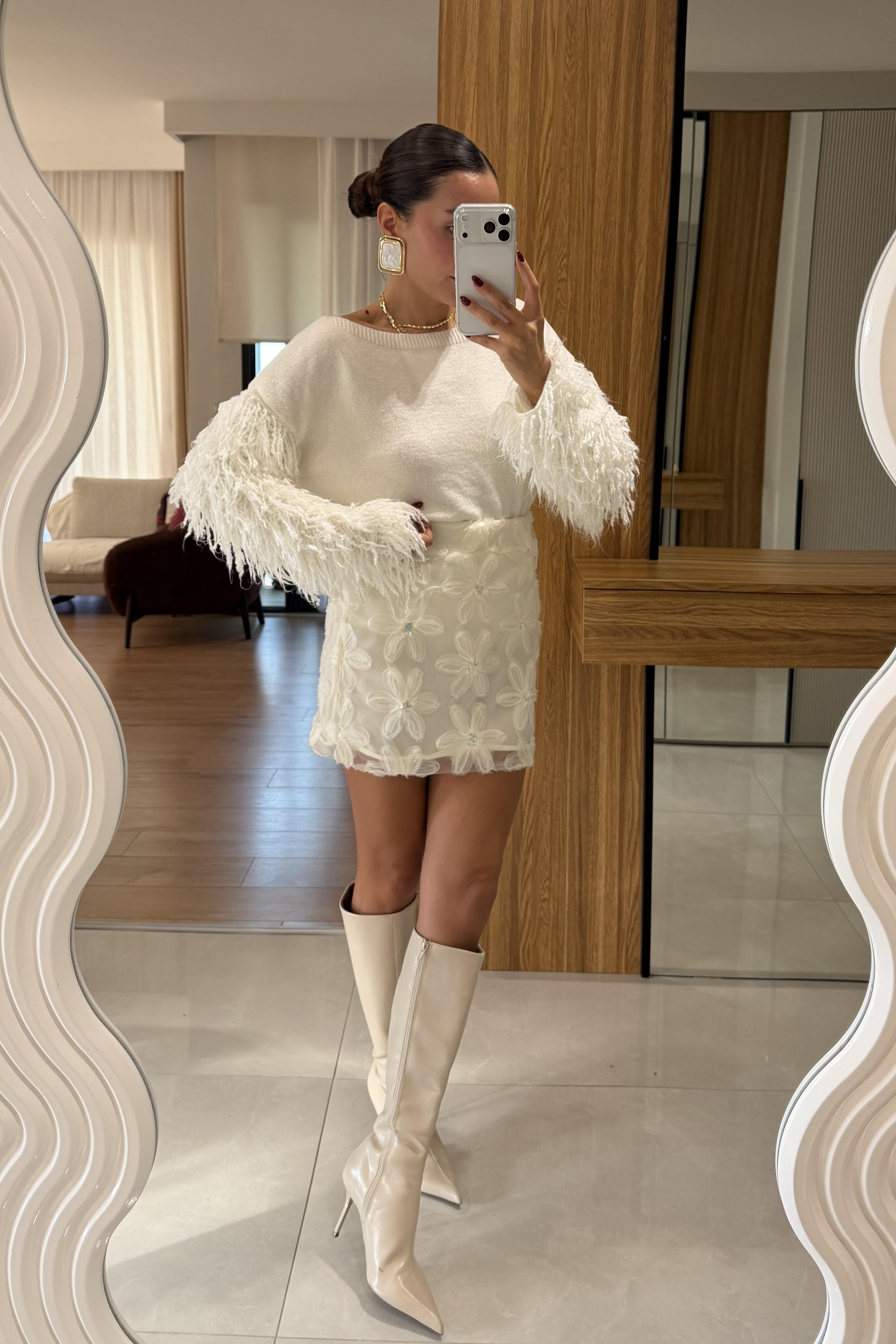 Famax Beyaz Çiçek Kabartma Etek (Z5474)
