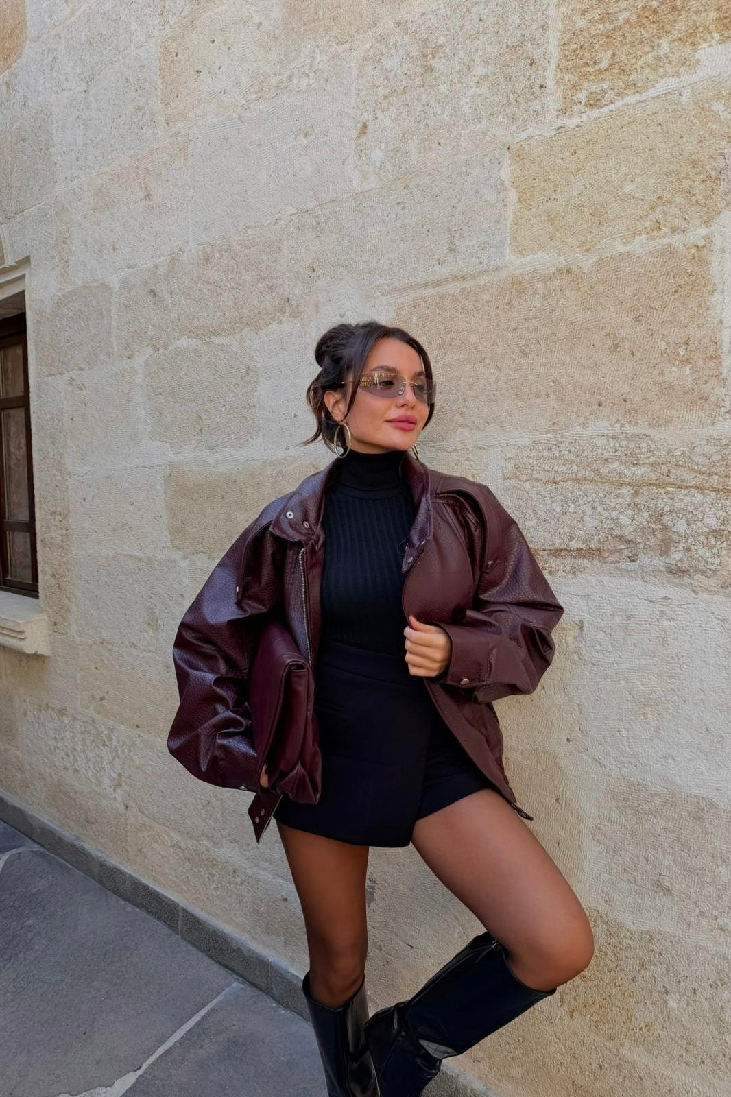 Macoron Bordo Pütürlü Deri Ceket