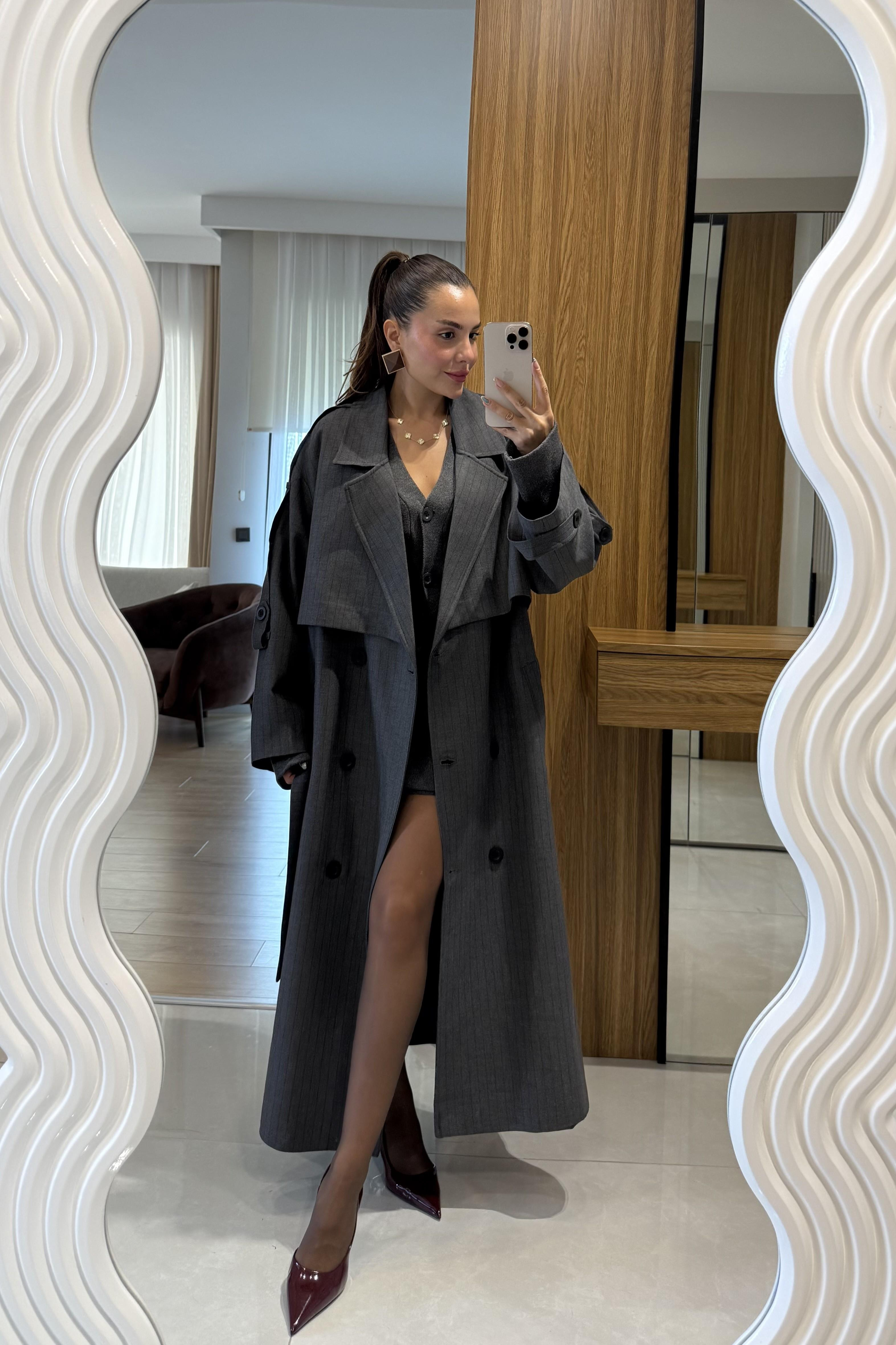 Nesha Antrasit Çizgi Detaylı Trenç