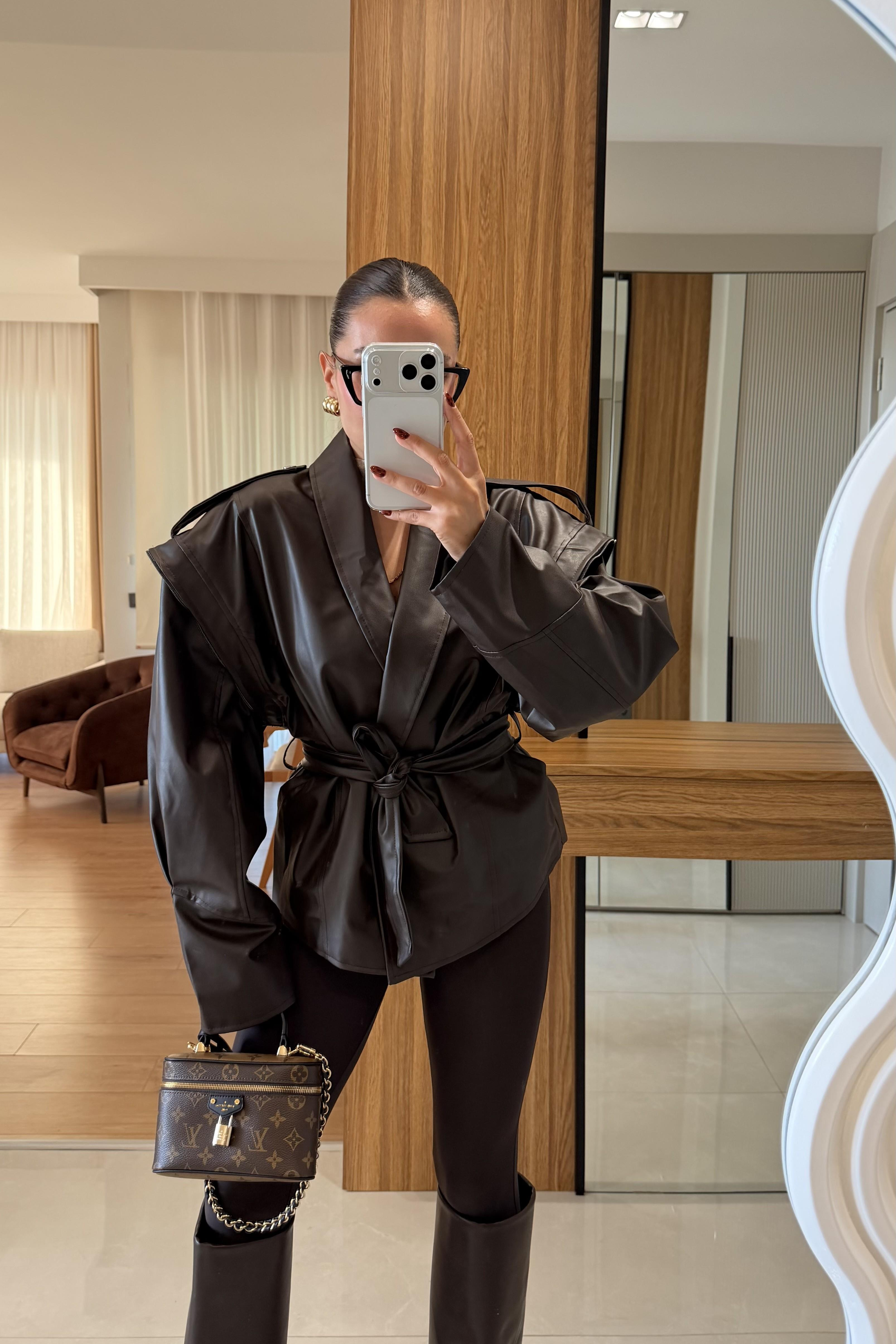 Newyork Acı Kahve Tasarım Kuşaklı Deri Ceket