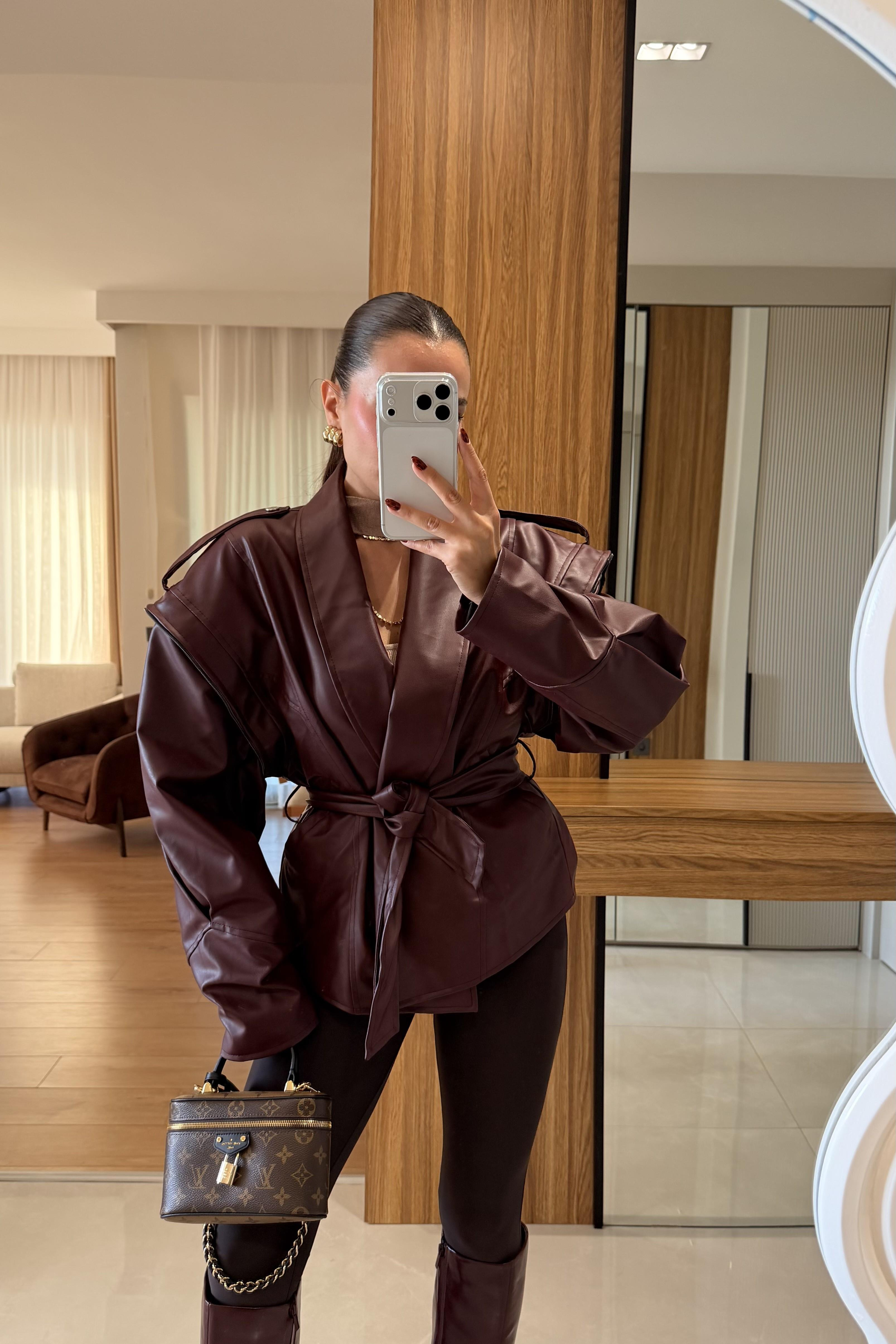Newyork Bordo Tasarım Kuşaklı Deri Ceket