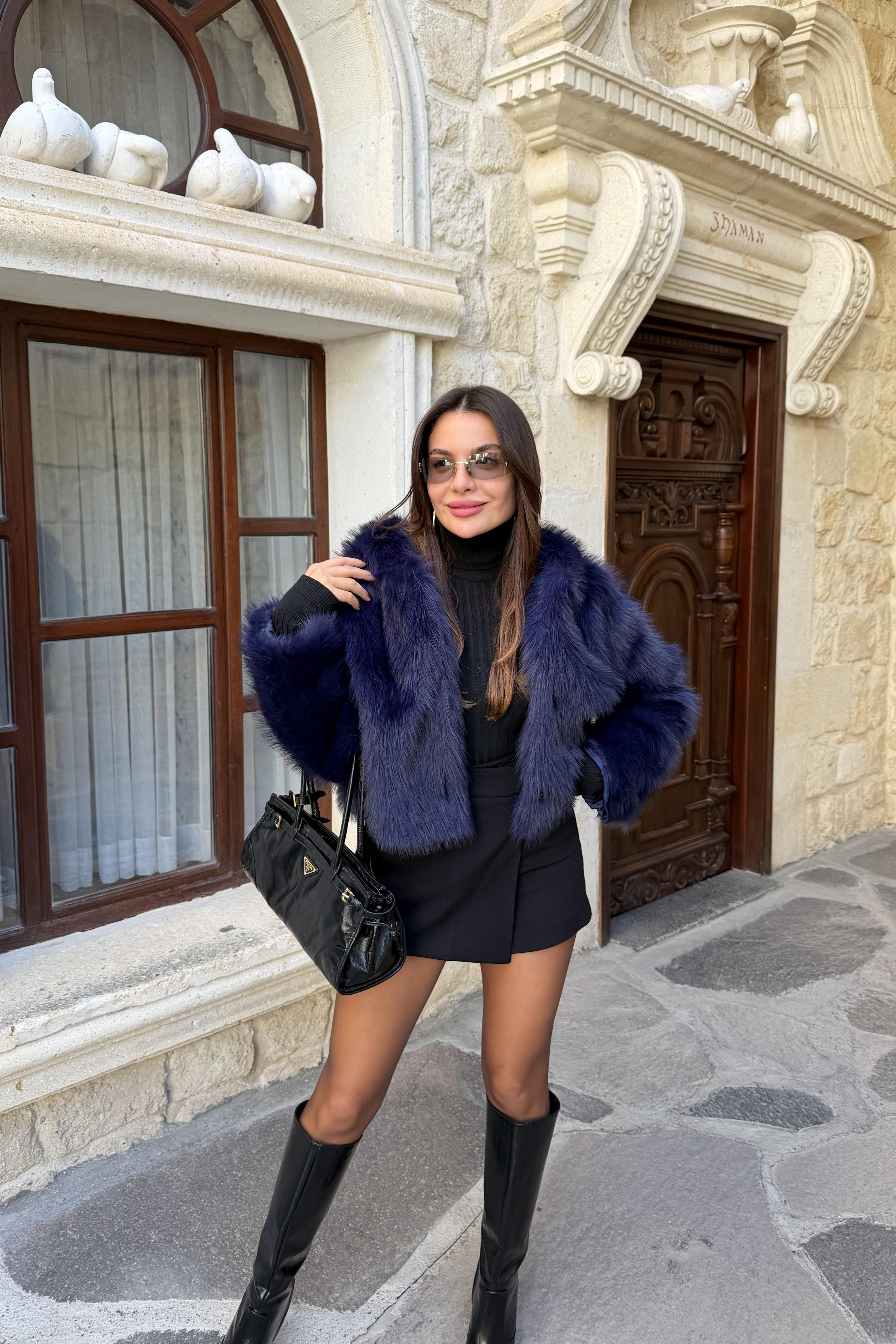Prenson Mavi Kapüşonlu Kürk (Z5591)