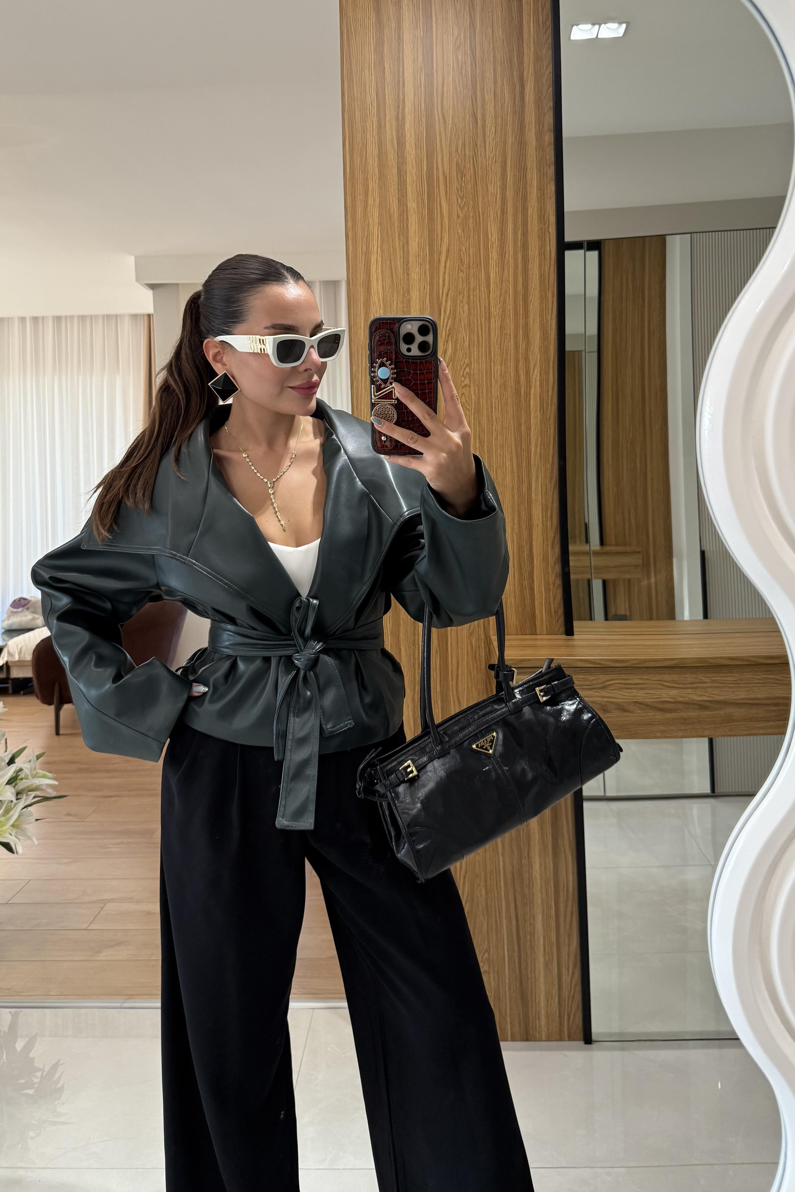 Quality Haki Deri Kemerli Ceket (Z5266)