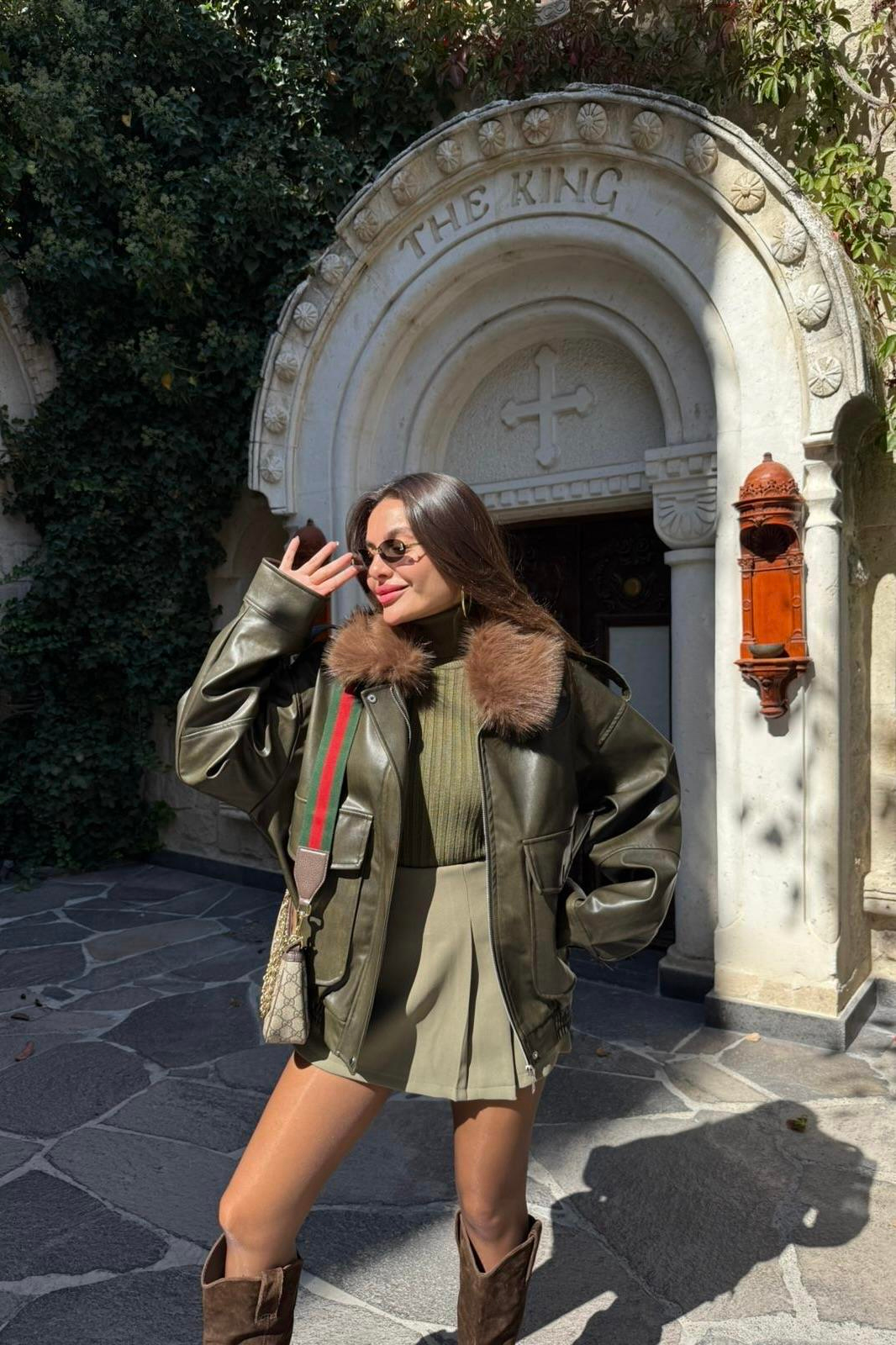 Rosanna Haki Kürk Yaka Deri Ceket (Z5585)